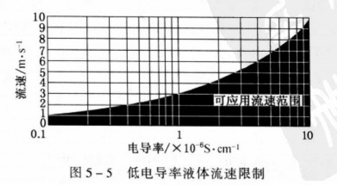 根據(jù)使用經(jīng)驗(yàn),實(shí)際應(yīng)用的液體電導(dǎo)率要比儀表制造廠規(guī)定的閾值至少大一個(gè)數(shù)量級(jí)。因?yàn)橹圃鞆S儀表規(guī)范規(guī)定的閩值是在各種使用條件較好狀態(tài)下可測(cè)量的最低值,實(shí)際上常受一些使用條件限制,如電導(dǎo)率均勻性、連接信號(hào)線、外界噪聲等。實(shí)踐中多次遇到測(cè)量低度蒸餾水或去離子水,其電導(dǎo)率接近5 x 10-6S/cm,雖仍可測(cè)鼉但使用時(shí)出現(xiàn)輸出晃動(dòng)現(xiàn)象。ADMAGCA型電容電極電磁流量計(jì)對(duì)用于純水、純酒精等低電導(dǎo)率液體還進(jìn)一步作了限制流速(見圖5-5)和裝較長直管段長度(20D)的建議,以減少流動(dòng)噪聲影響。